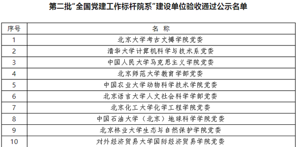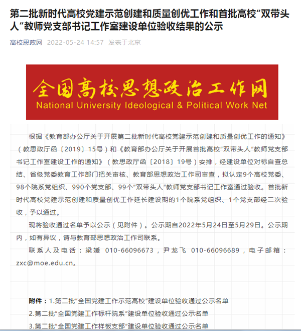 根据《教育部办公厅海角网 开展第二批新时代高校党建示范创建和质量创优工作的通知》(教思政厅函〔2019〕15号)安排,经建设单位对标自查总结、省级党委教育工作部门把关审核、教育部思想政治工作司审查,认定9个高校党委、98个院系党组织、990个党支部、99个“双带头人”教师党支部书记工作室通过验收。