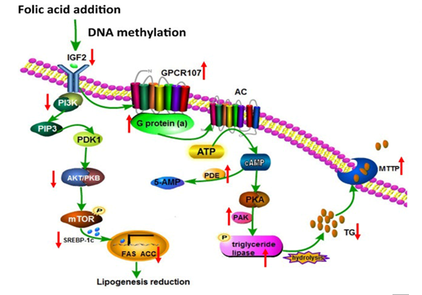 同时,该团队利用鸡原代肝细胞培养模型,结合蛋白组和代谢组技术发现叶酸可通过Insulin/IGF介导PI3K/AKT/SREBP通路抑制鸡原代肝细胞脂质合成代谢,促进脂质水解和胞外转运,缓解肝细胞内脂质积累;进一步在体研究表明叶酸灌注可显著抑制肉鸡肝脏脂肪酸和胆固醇合成,下调IGF1和TGFβ2的表达以抑制腹脂内脂肪细胞增殖,降低肉鸡腹脂沉积。以上研究阐明了叶酸调控或传代调控肉鸡脂代谢的具体机制,相关成果发表于《Journal of Agricultural and Food Chemistry》杂志(中科院农林科学一区,TOP期刊)。