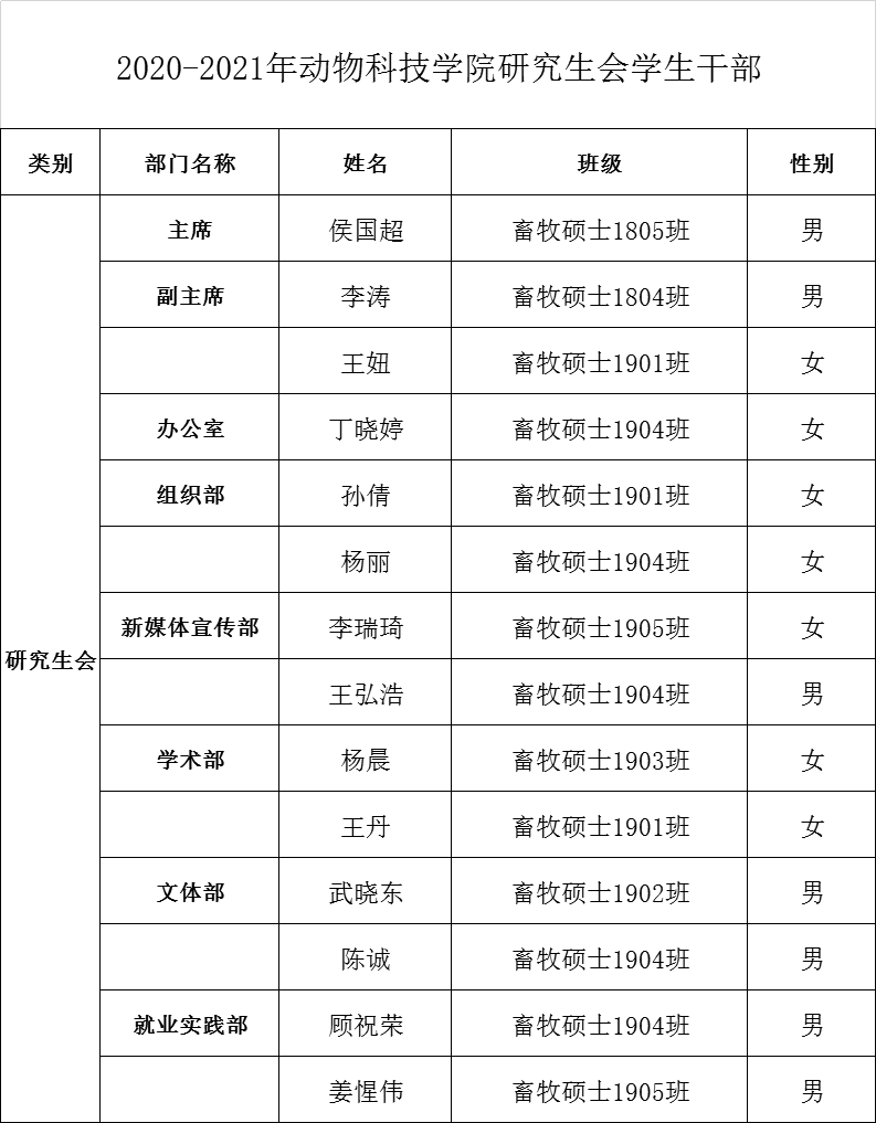 按照工作安排,经学生个人申请、学院研究生会学生干部换届领导小组进行资格审查,经2020年8月24日“动科学院2020-2021学年研究生会学生干部换届选举大会”选举,建议由下列人员作为动科学院2020-2021学年研究生会学生干部,现公示如下: