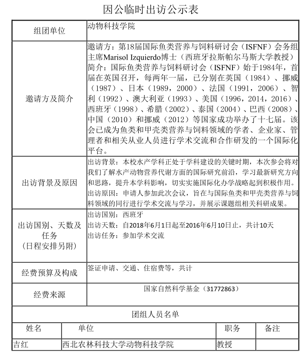 现将吉红教授因公出国情况予以公示,具体情况如下表:
