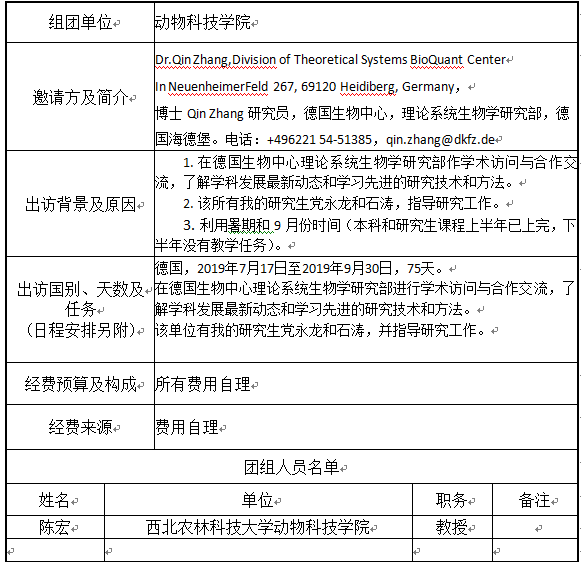 现将陈宏教授因公出国予以公示,公示期自2019年6月6日至2019年6月10日。如有举报意见,请以书面或以口头形式向学院党政综合办公室110室反映,电话87092937。(公示内容见下表)