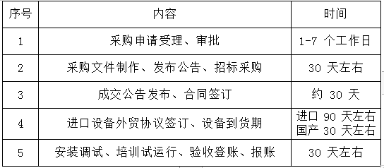 三、已完成采购项目前期准备工作的采购单位(包括前期调研、采购方案、技术参数的制定、50 万元以上大型/进口设备的论证及 200万元以上设备查重等内容),进口设备须在6 月30 日前提交采购申请,国产设备须在9 月 1 日前提交采购申请。如逾期提交采购申请,则无法确保本年度内完成采购计划及预算采购资金的支付,为避免各单位年底国库集中支付压力,请各单位高度重视、履行职责、切实加强项目管理,按期完成本单位采购任务。