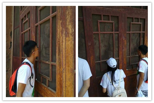麦积山石窟开凿在悬崖峭壁之上,洞窟“密如蜂房”,栈道“凌空飞架”,层层相叠,其惊险陡峻为世罕见,形成一个宏伟壮观的立体建筑群。志愿者们踏上了环山的木梯,透过窗网,泥塑的佛、菩萨、弟子、供养人等形象清晰可见。其中七间八柱庑殿式结构,高约九米,面阔三十米,进深八米,分前廊后室两部分。立柱为八棱大柱,覆莲瓣形柱础,建筑构件无不精雕细琢,体现了北周时期建筑技术的日臻成熟。队员们深深的折服于石窟中所蕴含的佛教文化,飞天壁画及北朝的建筑文化所折服,沉浸在石塑大佛的磅礴气势之中。
