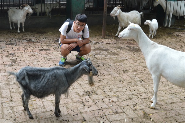 来到中国克隆动物实验基地,队长首先与管理的隋老师进行了交流,了解了基地的规章制度,希望老师能带领全队同学参观整个基地,并做相关的讲解。在老师的带领下,队员们首先来到饲养转基因羊的羊舍,共八只,其一只呈灰色,个头较小的母羊就是克隆羊“阳阳”,如今它已有十五高龄。据介绍,“阳阳”是中国第一只利用体细胞克隆技术培育出来并具有生育功能的母羊。这也使得我国在这一方面处于领先地位。在实验基地的另一边,饲养着著名的西农萨能奶山羊。据了解,每年会有外商不定期来这里采购公羊与当地母羊结合提高其产奶量。而萨能奶山羊的经济效益颇高,六个月之内的羊价格是6500元,六到八个月的羊8500元。
