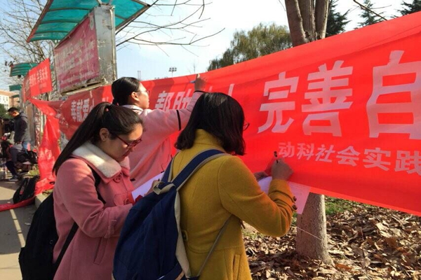 活动当日,海角网 实践部成员在西雕集合张贴题为“奉献爱心,弘扬新风,帮助他人,完善自我”的横幅,向过往师生介绍宣传志愿服务精神,并邀请同学们在横幅上签名留影,共同为志愿精神的推广做出努力,该活动引发了过往同学的强烈兴趣,大家停下步伐,积极配合,在横幅上签下自己的名字,表明自己积极弘扬志愿精神的决心,活动进行地十分顺利。同时,工作人员也向同学们发放了介绍志愿精神的宣传单,以此鼓励大家关注了解志愿精神,并身体力行地加入到志愿者的队伍中去。