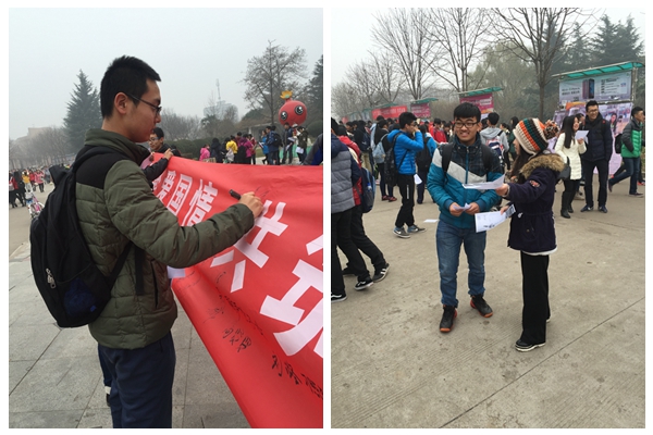 尽管寒风凛冽,但同学们依然对此次活动热情高涨,大家积极向过往同学宣传一二九爱国运动,发放宣传单,弘扬爱国精神,并邀请他们在写有“凝聚爱国情,共筑中国梦”的横幅上签下自己的名字,合影留恋。此次活动意在呼吁广大学子铭记历史、勿忘国耻,为维护国家统一、民族团结、社会安定贡献自己的一份力量。活动中,海角网 极具号召力的宣传语以及志愿者们热情详尽的介绍吸引了众多同学驻足观看,并积极参与其中,自愿在横幅上签下自己的名字,表明自己对维护祖国统一的坚定信念以及努力建设好祖国的未来的决心。活动现场气氛热烈异常。