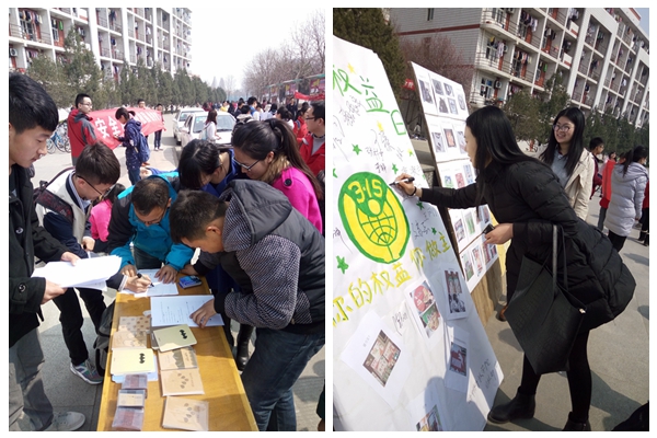 工作人员通过画板向广大师生展示了当今市场中鱼目混珠的商品,无论是日常用品、食品、运动商品等,都有出现营销劣质品、非法盗用大型品牌等不法行为,以假乱真在中国市场上层出不穷,干扰了消费者的购物观念,更甚者卖出的假冒伪劣产品对消费者的健康构成严重危害。该活动通过简单的对比让大家明辨真假,从而更加强有力的抵制假冒伪劣行为,打击不法商家的嚣张气焰。