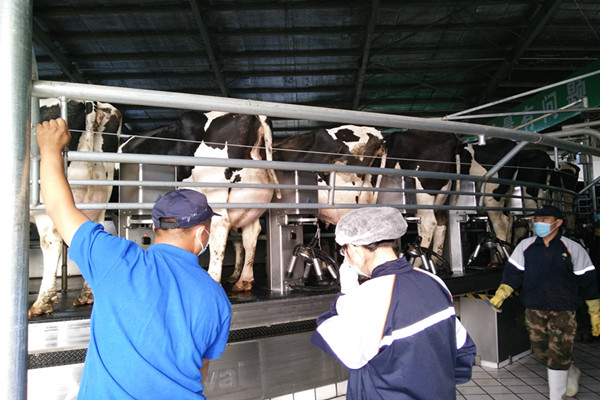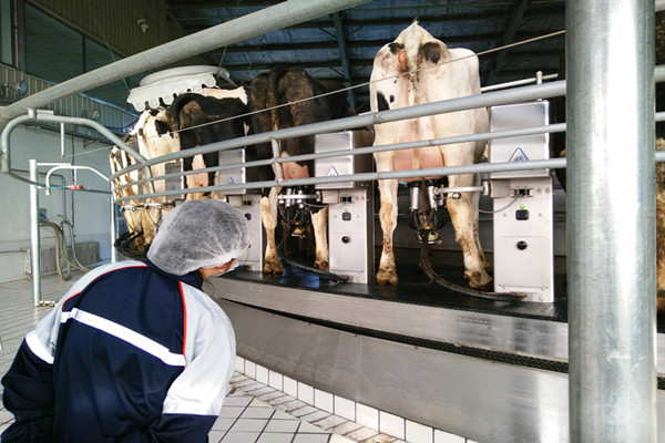 首先,在工作人员的指导下,队员们来到消毒间,进行全面细致的消毒,同时了解牧场安全注意事项。随后,队员进入挤奶厅,在挤奶工作台做最后的准备工作。经工作人员介绍,牧场的挤奶设备几乎是国内最先进的,每一头奶牛都有自己对应的“身份证”,电子化的设备记录每一头牛的产奶情况。此外,队员们也学到了一些基本知识,如患病的牛会隔离进行挤奶,在挤奶的时候需要将牛尾巴上的毛剪掉等必要防护措施,防止上面的细菌感染到牛乳房。在工作人员的帮助下,同学更是切身体验挤奶的全部过程。队员邢倩表示,挤奶厅与她想象的挤奶方式完全不同,几千头奶牛挤奶只需要四五名工作人员,这是她自己难以想象的。
