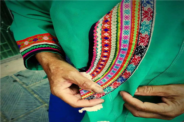 “格多”是苗语音,意为大寨子,包括了格多、阳久、阳颂、欧勇、嘎笑、阳亚等六个自然苗族村寨。村寨保留了厚重的苗族气息,其苗族服饰、语言、习俗和杆栏式古建筑保存较好。在调研活动准备阶段,队员们通过书籍、网络等方式苗族文化有了基础了解。但实地调研过程中,同学们对陌生的文化环境仍不知所措。接受队员采访的一位苗家阿姨热心地为服务队带路,向同学们科普青苗、红苗等苗族知识。在阿姨的帮助下,队员们如愿见到苗族刺绣,纷纷被苗绣独特的花饰纹路、传统的手工技法折服。