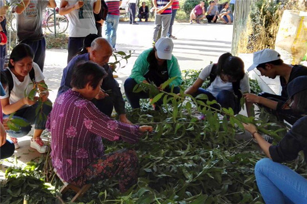 十七日一早,队员们乘着公交奔赴合作社。到了合作社,大家便发现合作社工作人员正在剪去桃枝上的叶片,在桃园管理员的介绍下得知:除去桃枝上的叶片是为了嫁接的顺利进行。随后,队员们便在工作人员的指导下,大家一起动手为桃枝除去叶片。由于此时恰逢秋施基肥的时节,队员们便向桃园管理员咨询了施肥量、施肥种类和施肥方法等相关问题,并做好了记录。在听桃园管理员讲解的过程中,同学们结合自己的专业知识以及科学常识,向管理员提出了一些相关建议。管理员表示将会仔细思考并实施队员们的想法。实践结束后,大家准备离开,管理员送给队员们一本小手册:秦鲁果业引种指南。归程途中,队员们相互传阅,详细了解田间实际生产情况。