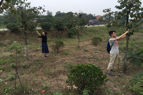 随后队员们自己拿起工具,正式开始采摘,有的柿子压低柿伸手就可以摘到,有的需用竹竿去扭,队员们积极主动,干劲满满,很快完成任务,采集一麻袋柿子。周老板看后对同学们的劳动成果给予肯定。