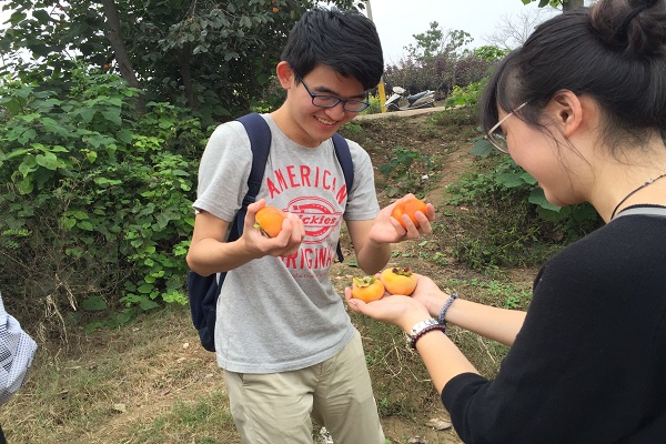 首先周老板的带领同学们来到田间,教授其如何辨认成熟柿子又如何采摘。周老板表示,柿子通常十月成熟,但此刻已有部分需要采摘,低处的柿子手摘即可,高处的柿子需用棍子敲下后收集。听到周老板的讲解,队员杨世博颇听后有所悟的表示:自己经常吃柿子,但从未知道摘柿子有这么多讲究,今天学到了这些感觉十分新奇。