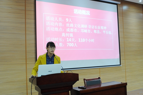 本次会议,赴汉中精准扶贫、赴四川丝路文化、赴秦巴山区精准扶贫、赴陕西正大集团蛋鸡示范场、赴安康水产示范站、赴川西平原基层群众对中国梦的认知情况调研服务队六支优秀队伍以PPT的形式向我们展示了每支队伍的三下乡成果,用大量的照片向我们展示了实践活动的内容和工作环境。从活动申请、调研形式、经费发放等方面讲述了实践活动的具体流程。赴四川丝路文化调研对代表马锦荣同学用一小段视频向我们展示了她们团队在成都开心、幸福的调研生活。现场同学们兴趣浓厚,积极与各队代表互动交流。