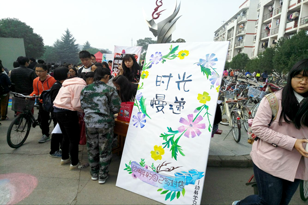 活动前期通过发放传单、网络平台、宣传画板等形式对此次活动进行的宣传为本次活动奠定了广大的群众基础。活动期间,拿着准备好的“慢递”来到现场的同学络绎不绝,他们将对未来的美好祝福及期许进行封存,投入了时光的信箱。热闹的场面吸引了很多过路同学的驻足,不少同学在现场挥洒笔墨:诉说入校心得、描绘大学生活、感慨青葱岁月。将情感融入文字,经过时间的洗礼,不紧不慢地来到时,便会多了一份难以言说的情愫。任凭岁月老去,“时光慢递”帮你回首来时的自己。