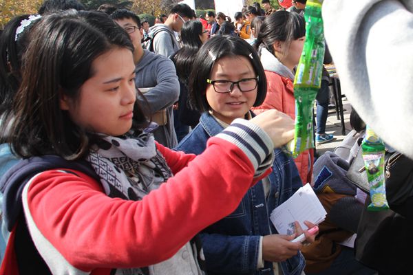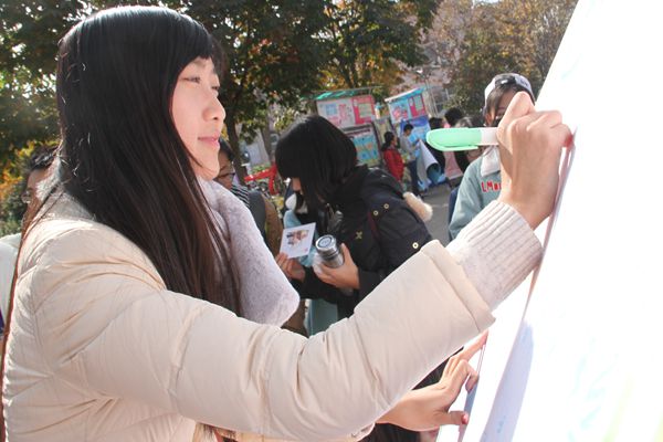 11月11日的“光棍节”作为一种校园趣味文化已延续多年,为庆祝这一独特的节日,丰富学生课余生活,缓解学业压力,给同学们一个面对自我的平台,展现我校学生青春的蓬勃朝气。海角网 宣传部于11月11日中午在西区雕塑旁举行“开心写意”活动。