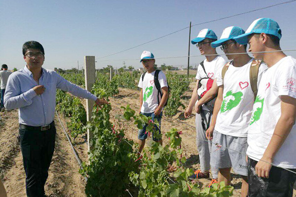 醒目突兀的欧式大门,一望无际、绿意葱茏的葡萄田,临沙傍水而建的葡萄庄园,静谧和谐,尽显辽阔神秘之美,犹如人间胜地一般的景象正清晰地呈现在在队员们的眼前。7月11日,海角网 赴甘肃武威一带一路与葡萄酒产业发展调研服务队来到了位于武威市郊的威龙有机葡萄酒庄园。在庄园负责人杨彦军总经理的带领下,队员们实地考察了葡萄酒庄园,了解了武威有机葡萄的种植规模及发展历程。