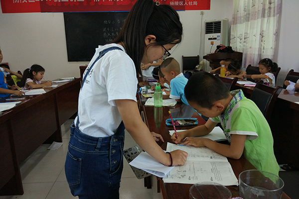 新集村位于杨凌区的西部边缘,队员们乘坐班车前往,到达时,已有两三个家长与学生已经在等待着。随着支教结束时间的逼近,部分课程都转为作业辅导课,主要目的是增加解答疑问的时间,以便让学生能够在队员们的帮助下完成假期作业,度过一个更快乐的假期。第一节课便是辅导学生们的作业,支教进行的期间内,队员们每天都会给学生们安排合适的作业量,并为他们解答疑问。在队员们的帮助下,孩子们的作业在有条不紊地完成的同时质量也非常高,收获了预期内的效果。课堂间隙,学生们在小老师的带领下,有序地排队上卫生间,而部分队员也会和不需要前往的学生一起聊天,解答生活上的问题,尤其对于性格内向的学生,大家会主动引导话题来帮助他们。此外,“数数报团”等小游戏是学生的最爱,这充分地调动学生的积极性,增进了相互之间的感情。