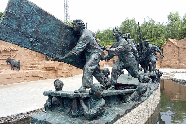 雕塑园从前到后讲述了从我党建立农村革命根据地到解放战争,这两个时期发生在当地的历史事件。前面部分中龙须崮暴动时的群情激奋、秘密宣誓入党时的庄重与坚决、摊煎饼支前的热情,军民鱼水一家亲的温馨暖人给队员们留下来深刻的印象。后半部分中“最后的新娘”、“送最后一个儿子上战场”、“女子火线桥”等一个个故事感人至深,表现了战时根据地人民对党的支持与忠诚,令人震撼。孟良崮战役中人民军队的顽强与无畏深深影响着队员们。陈毅元帅曾在诗中这样写道“孟良崮上鬼神号,七十四师无地逃。信号飞飞星乱眼,照明处处火如潮。刀丛扑去争山顶,血雨飘来湿战袍。喜见贼师精锐尽,我军个个是英豪。”