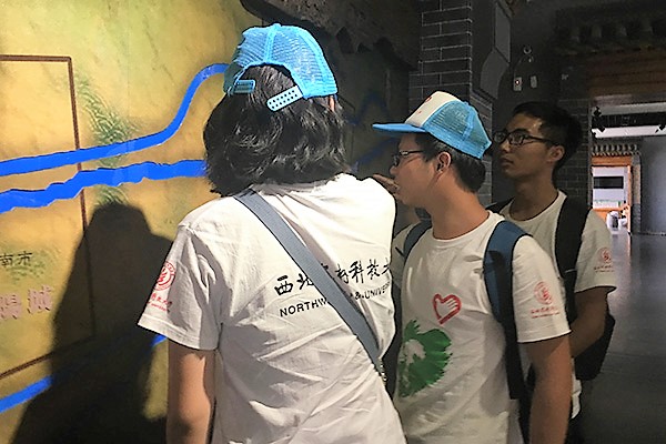 入馆伊始,同学们了解到隋唐大运河博物馆依托山陕会馆而建,由琉璃壁照、东西仪门、舞楼、正殿等风格独特的古建筑群组成。进入侧馆,隋唐大运河的轮廓映入眼帘。隋唐大运河本是隋炀帝一项为加强中央集权的暴政,但今日看来它却促进了南北之间的经济文化交流,一直延续至今,同时也是丝绸之路上不可或缺的重要环节。隋唐大运河以洛阳为中心,北起涿郡(北京),南至余杭(杭州),南北的物资会源源不断运输到洛阳,再通过丝绸之路远赴西域各地。洛阳利用丝绸之路与隋唐大运河交汇之便,聚集了来自世界各地的船舶和商品,使洛阳呈现出胡汉交融的国际大都市景象。