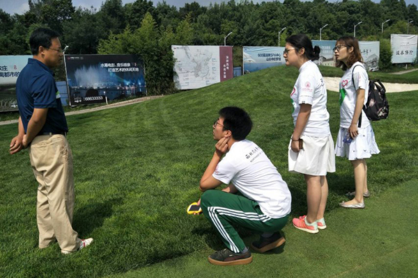 在得知队员们的学习学科后,王博经理针对不同区域差异的草种,给大家做了详细地讲解,如发球台和果岭使用匍匐剪股颖,高草区为高羊茅和草地早熟禾混播草地。其间,队员们还询问了国内高尔夫行业的状况,王经理表示:“近几年,随着一带一路相关政策的颁布,当地人民逐渐富了起来,越来越多的人开始接触高尔夫运动,相信高尔夫运动将会有很大的提升空间。”