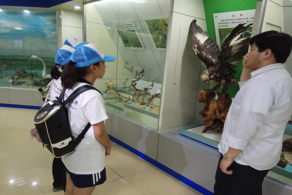 此后,通过与黄河口湿地博物馆馆长的协调与安排,团队成员进入博物馆后在博物馆工作人员的带领下,进入各个展厅参观,团队成员首先了解的是黄河口湿地改造计划过程,工作人员详细介绍了黄河口湿地的变迁历史与未来展望。简短的停留认知之后,团队成员来到第二个展厅,与第一个展厅不同,第二个展厅以野生动物为主,工作人员以幽默诙谐的语言和生动活泼的案例为团队成员讲解了湿地中的各种野生动物,比如东方白鹳、绿头鸭、白鹭、天鹅等野生动物的生存现状与迁徙习惯。