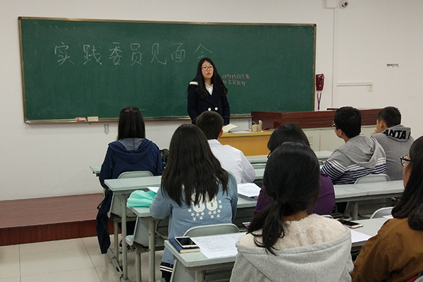 随着实践委员及社会实践部人员的一一入座,会议正式开始。社会实践部部长张丽芸首先向大家介绍了班级社会实践活动的管理制度,要求各实践委员严格履行自己的职责,积极举办实践活动。她还为大家普及了社会实践活动的参与形式,她讲道:“文艺下社区、义务支教、田园使者、大学生村主任助理、回访母校、三下乡等都是可供选择的社会实践形式,但不只局限于这些形式,希望大家充分发挥自己的创新能力,举办更多新形式的实践活动,展现当代大学生的风采。”随后往届优秀实践委员纷纷上台分享各自的经验,优秀实践委员代表张飞耐心地为大家强调注意事项:“一定要结合实际情况去开展活动,活动前的准备,活动后的总结都要精心策划。”在最后的交流讨论环节中,新一届的实践委员积极地提出自己的疑惑,往届优秀的实践委员们则耐心解答,气氛活泼有序。