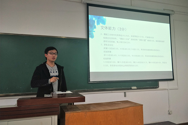 宣讲正式开始,校素拓张志浩部长详细的介绍了创八的评定细则及注意事项,并接受了同学的提问。创八“八项”主要包括:科技创新,社会实践,校园文化,体育活动,学科竞赛,行业证书,作品发表,素质教育报告会八个方面。随后,院秘书处处长丁彦之为同学们细致讲解了综测的三个主要方面,德育、体育、智育,消除了同学们的疑问和困惑。最后,勤工外联部副部长耿硕为同学们介绍了阳光团工委的发展历史和目前现状,以及阳光团员的使命以及对阳光团员们的考核细则。耿部长讲解到,“我们阳光团工委的宗旨是乐观生活、常怀感恩、无私奉献”。在阳光团员代表张程同学的带领下,与会全体阳光团员庄严宣誓,正式成为阳光团的一份子。