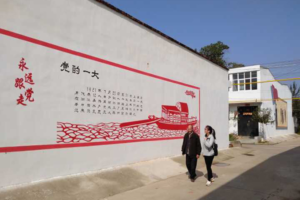 刚进村子,两位村主任助理便感受到了 “喜迎十九大”的浓烈气氛:村子里墙壁上涂绘着各色十九大的宣传画,大部分宣传画的旁边都围着许多村民观看学习,上到老人,下到小孩。从他们脸上的笑容中,两位村助感受到在党的领导下,人民的幸福指数已有了很大提高。两位村助在此热烈氛围的感染下,立即开展了工作,主要从“中共建党90多年来共经历的十个主要阶段”、“中国共产党是如何诞生的及诞生的历史条件”、“党自1921年以来十三次全国代表大会的基本内容自以及历届领导人”、“中国共产党的组织机构”等方面进行了宣讲。村民们热情高涨,更是有一位老人拉着村主任助理一起观看村里的“党的发展史”宣传画。