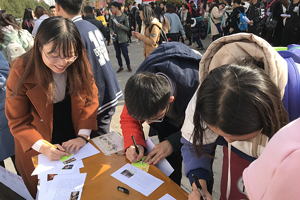 此外,在同学们书写之时,部委们现场分发印有感恩节暖心小故事的卡片,让同学们在寒冷的冬天怀揣着感恩与故事中的人物隔着时间与空间相互交流、收获感动。一旁的易班熊也与同学们真诚的握手并送上爱的拥抱,让同学们在感慨易班熊的可爱之时也感受到了它给予的温暖。