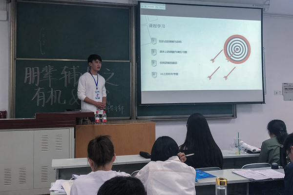“专业一等奖学金,三好学生……”随着主持人的介绍结束,阵阵掌声涌起,同学们热情欢迎两位十分优秀“学长老师”的到来。课堂伊始,张黎同学结合自身学习经历,着重讲述学习方法。他讲到:“我想与大家分享的不仅仅是一门学科的知识,更重要的是学会学习方法。上了大学最重要的是克服自己的惰性。”解答了许多困扰同学们的问题。刘涛同学为大家带来了不少“干货”,他将有机化学碎片化的知识点串在一起,生动形象地解释了许多困扰已久的问题,使原本枯燥乏味的的有机化学在他饱含热情的讲解之下变的生动有趣,引人入胜。两位朋辈讲师还和大家分享了一些大学趣事,活动很快在欢声笑语中落下了帷幕。