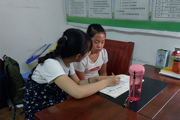 鉴于孩子们的年龄差异,调研队员选择对其进行一对一暑期作业辅导。调研队员首先解答了孩子们不明白的知识点,其次对其暑假作业进行检查订正,重点解决其知识盲点,对症下药。即将升入四年级的李佳辉英语十分优秀,她对队员说到:“我的英语和数学都不错,但是有几个知识点一直不太清楚,希望哥哥姐姐们能帮我解决。”