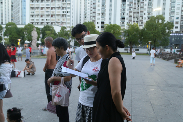 经过一早上紧锣密鼓的前期准备工作,“万事俱备,只欠东风”。调查队选择五点半至七点半为发放问卷时间,因为此时音乐广场群众较多,问卷结果更具代表性。下午五点三十,调研队来到歙县张曙音乐广场,开始针对不同年龄、性别的居民发放调查问卷,力求受访群众的广泛性,确保调查结果的真实性。队员们在问卷发放的过程中,态度礼貌、彬彬有礼、落落大方,纵使活动进展到后期队员皆有疲色,但如若遇到受访者对问卷有不解之处,任然端正态度为之解惑。过程中,队员们始终把握主题,紧紧围绕徽派文化宣讲的目的,抓住机会宣讲徽派文化有关知识。