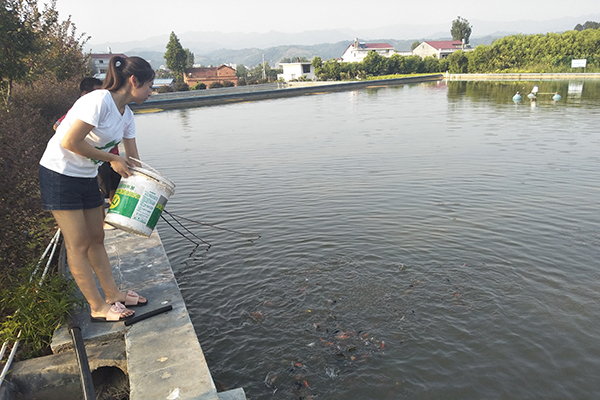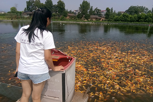 公司负责人陈总向调研队介绍了水产养殖园区的基本情况,园区拥有流转土地200亩,养殖池塘150亩,其中标准化商品鱼养殖池40亩、原生态纯土质养殖池40亩、垂钓养殖池50亩,引进黄颡、日本锦鲤、回鱼、台湾泥鳅等优质鱼苗30万尾。参观期间陈总结合当地村民养殖工作的现状,对本公司工作人员的分工,基地建设,发展规划,特色养殖模型的建立进行了详细的解释说明,面对同学们缺少实践经验,陈总也通过举例一一详细解答。陈总向调研队成员介绍到:“公司将总结多年养殖经验,下一步将在鱼苗的育种技术进行突破,推广鱼稻共生模式,带动全村农民产业创收。”在陈总的大力推动下,当地主要经济作物水稻和甲鱼的共生体系也被全村人赋予了新的符号。参观结束后,随之而来的实践工作便是参与定时定量定点投喂鱼苗,水质检测以及水体增氧等,在实践中得真知,加强理论知识的应用。