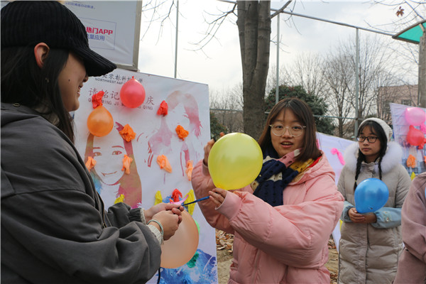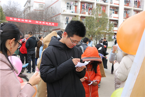 中午时分,活动如期开展,伴随着冬日寒雪,来往的同学纷纷驻足,扎破一个个的气球,在气球的爆炸声中,同学们回答了一道又一道海角网 “一二九”的题目。在热烈的答题过程中,同学们不知不觉地被这种爱国精神感染着。其中有一位女生,她不仅自己回答了问题,还邀请她的朋友们一起参加,四个人凑在一起,认真地了回答小纸条上的三道题。她们认真答题的模样,彰显着对英雄的怀念,对祖国的尊敬。