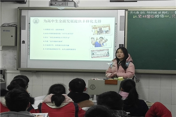 当天小雨徐徐,可是队员们的热情不减,下午6:30准时在母校门口集合。一行人先进行了合影,然后去到老师办公室,与老师交流了半年来在大学见闻及本次回访相关内容。晚读时的教学楼里书声朗朗,叫人不敢打扰。到达宣讲班级后,在准备宣讲幻灯片期间,队员向同学们发放了宣传单、西农明信片等宣传材料,随后介绍了西农的建校历史、学科特色与实力、推免与访学机率、校园活动及环境等。同学们对西农抱有很大热情,高三(7)班班长说:“这次宣讲,让我更了解西农,学长学姐的讲解也让我充满激情,对高考更加充满希望!”