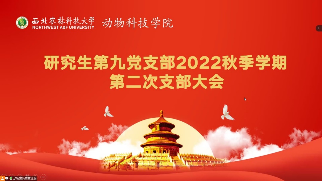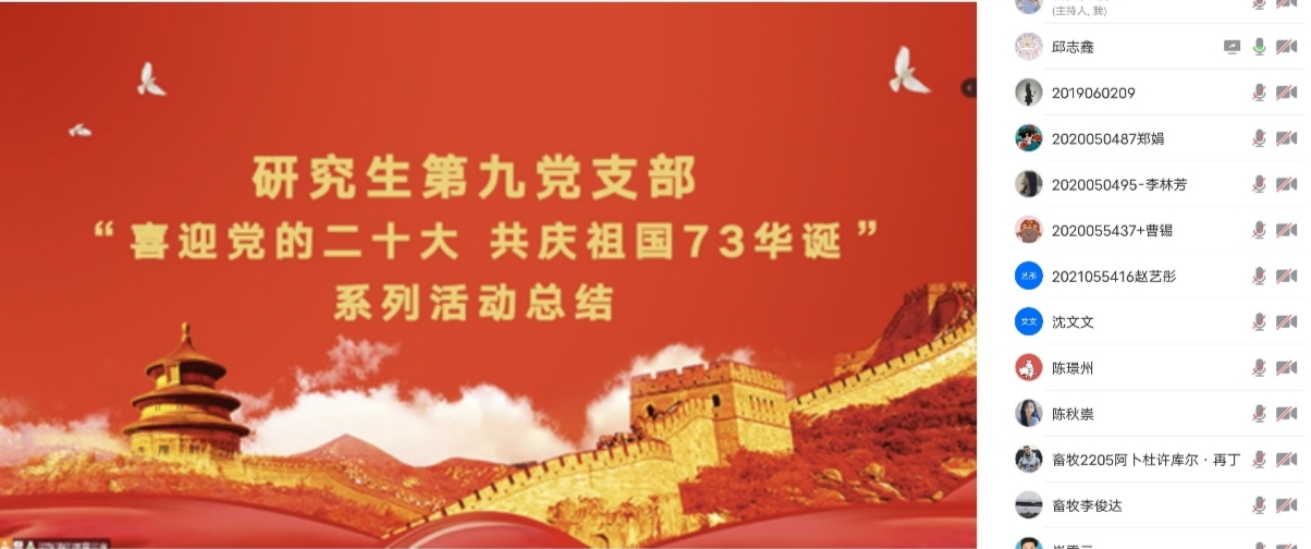 为喜迎党的二十大,庆祝新中国成立73周年,10月6日,海角网 研究生第九党支部召开以“喜迎党的二十大∙共庆祖国73华诞”为主题的秋季学期第二次支部大会,支部共计50余名成员参会,会议由支部书记胡张涛主持。