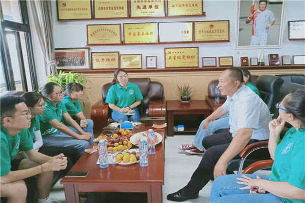 7月16日上午,队伍成员来到火墩村苹果基地会议室,与当地苹果基地创始人王玉静会面。王社长首先就扁担沟镇烽火墩村的基本情况进行了介绍,其中重点介绍了农民收入情况和来自特色产业带动收入,企业、合作社产业带动扶贫的情况,随后,在王社长的带领下,队伍参观了当地的果园,切身体会了当地果园产业的现状。