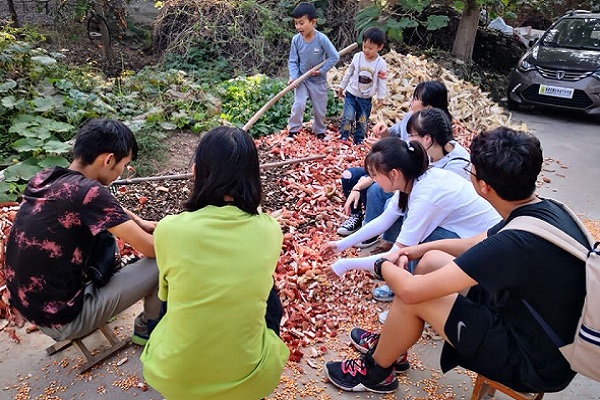 上午12:30分,队员们抵达村庄,村书记曹高仓驾车带领他们到达今天的工作地点,开始了剥玉米粒的工作。经过两天的熟悉,今天的工作开展得十分顺利。