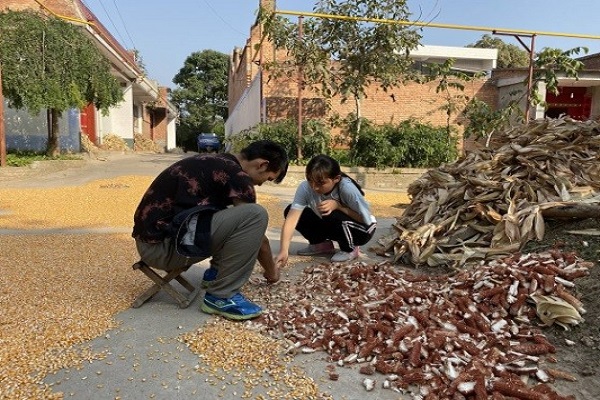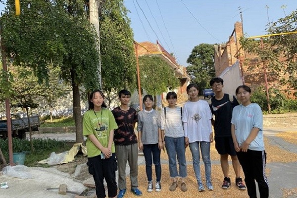 下午三点钟队员们到达了依托曹家堡村委会的金鑫苗木专业合作社。队员们见到了合作社负责人曹书记,并在他的领导下开展相关的活动。在和曹书记进行了简短的交流后,队员们了解到正值玉米丰收的时节,农户院子里晒满了玉米,还堆有大量的脱粒不干净的玉米核。曹书记安排队员们用手将这些未处理干净的玉米从玉米核上脱落下来。队员们分成两队对农户家中玉米核进行处理,在团结协作之下,很快就完成了任务。剥玉米核的过程枯燥无聊,还不免蚊虫叮咬,但是队员们的热情始终高涨,认真对待工作。队员们与曹书记合影留念之后,本次活动圆满结束。