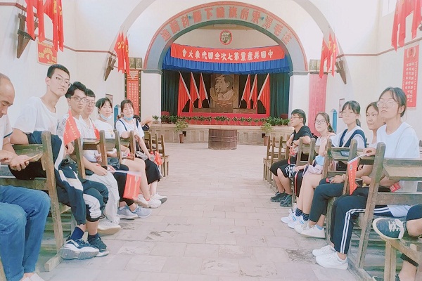 进入杨家岭后,队员们首先参观了中央大礼堂。中央大礼堂是为中共七大的召开专门而建,是一座中西合璧的建筑物,外表为西式建筑风格,走进里面却为类似窑洞的拱形结构。大礼堂是当时延安唯一一座没有木梁和木柱结构的建筑物。大家仔细听讲解人员介绍大礼堂的历史。这座古朴而又庄严的建筑,饱经了战火硝烟。而今它依旧闪耀着延安精神的光芒。听完讲解之后,队员们陷入了沉思,在长达半个世纪的风雨中,大礼堂用它独特的方式见证着历史变迁,也在见证着革命一步一步走向胜利!最终,队伍在七大会址前留下了具有纪念意义的合影。