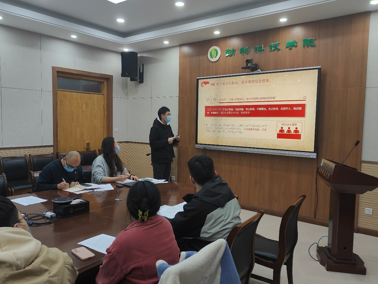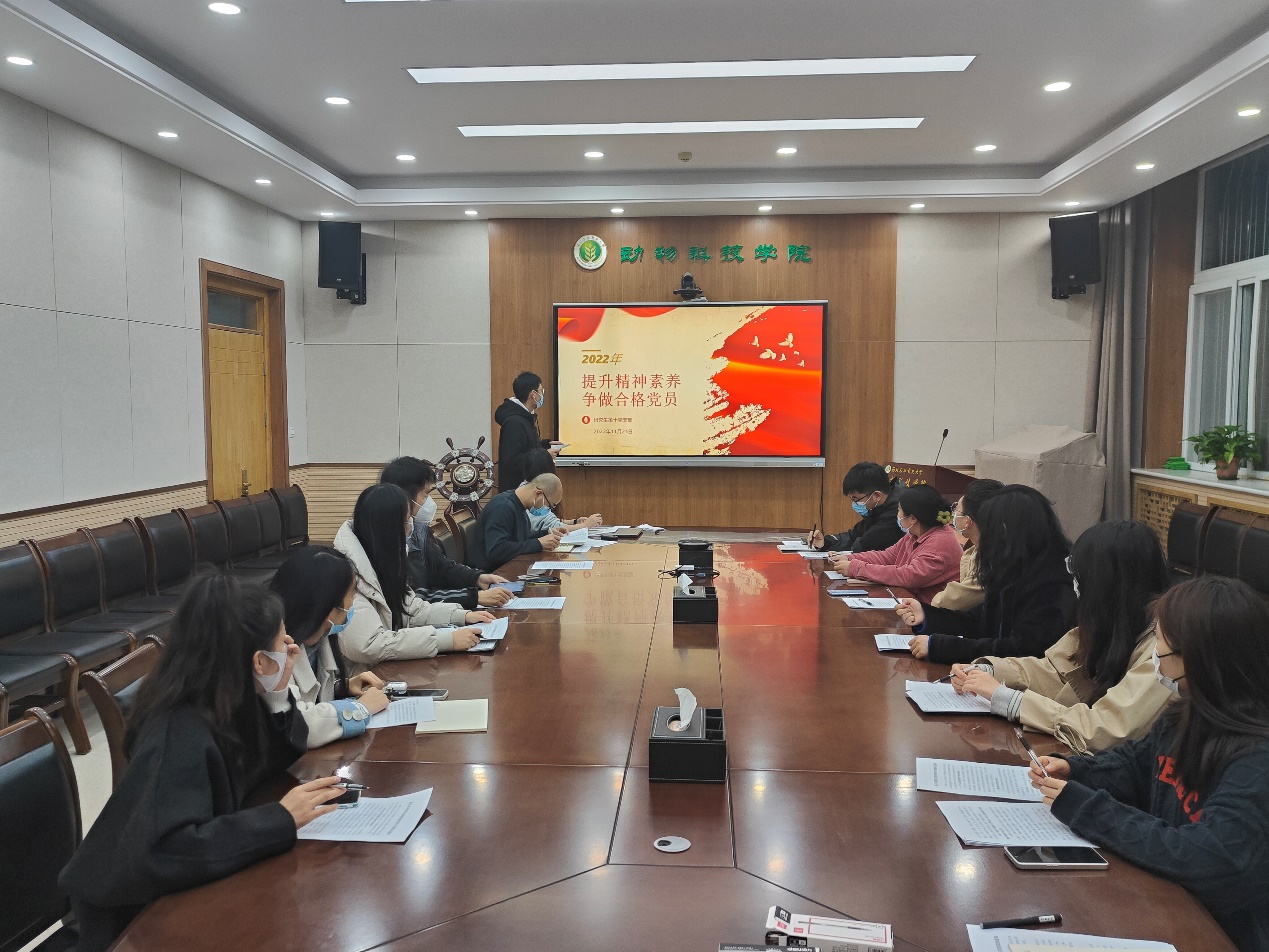 10月24日晚,研究生第十党支部于在动科104会议室就青年党员如何提升党性修养开展主题党日活动。党支部宣传委员李卓睿同志带领大家围绕“提升精神素养,争做合格党员”进行集体政治理论学习。