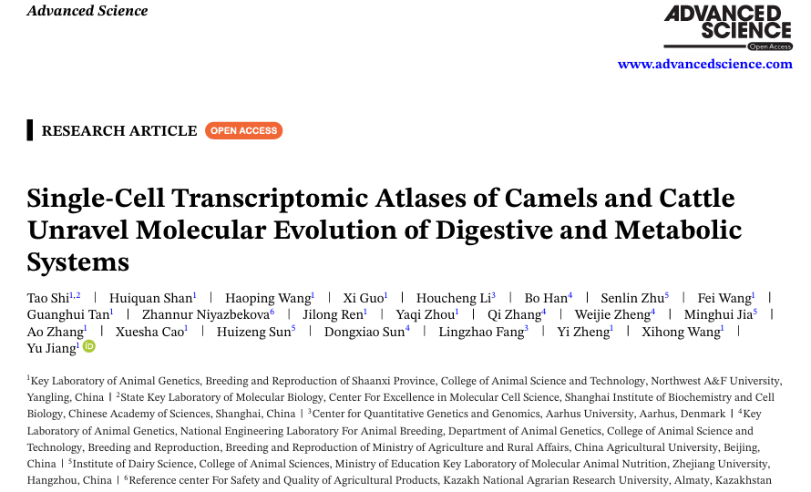 近日,海角网 动物大数据与功能基因组团队姜雨教授课题组在国际期刊《Advanced Science》在线发表题为“Single-Cell Transcriptomic Atlases of Camels and Cattle Unravel Molecular Evolution of Digestive and Metabolic Systems”的研究论文。该研究通过构建骆驼与奶牛多组织单细胞转录组及空间转录组图谱,系统揭示了多胃动物在消化、代谢与肾脏系统中的细胞层面进化创新,为理解环境适应性演化及家畜性状定向改良提供了全新的理论框架与细胞靶点。
