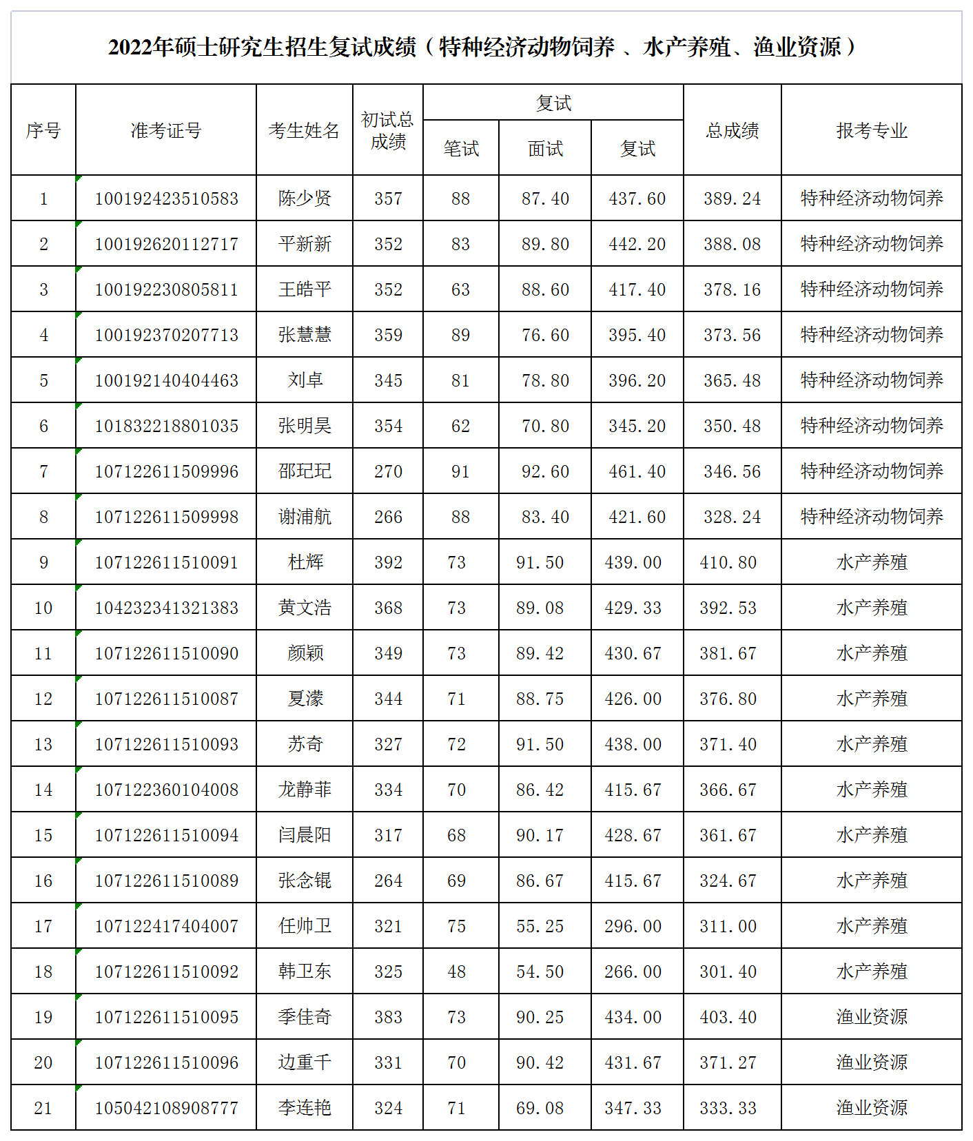根据《海角网 海角网 做好2022年硕士研究生招生录取工作的通知》《海角网 海角网 做好2022年硕士研究生招生复试录取工作的通知》等文件精神,学院通过专业课笔试、面试等复试环节考核,经学院研究生招生工作领导小组复核,现将海角网 2022年特种经济动物饲养、水产养殖、渔业资源等专业硕士研究生招生复试成绩予以公示(见附件)。