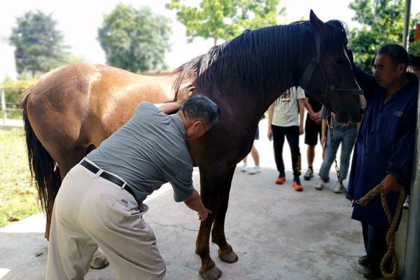 为提高教学效果,6月21日,党瑞华副教授带队选修马业概论课程的学生赴宝鸡市眉县关中马保种场进行现场教学,海角网 退休教授侯文通受邀现场示范指导。