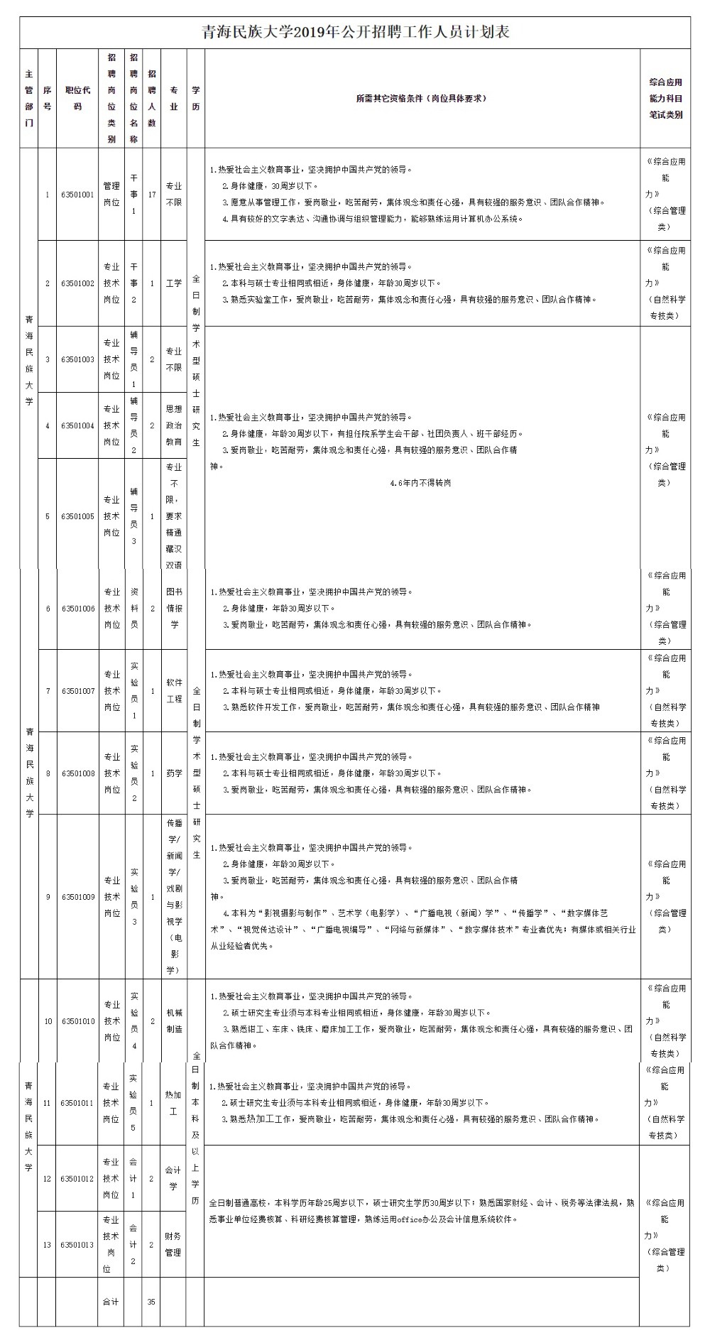 2019年,我校计划招聘工作人员35名,其中干事18名,辅导员5名,实验员6名,会计4名,资料员 2人。具体招聘岗位及条件见《青海民族大学2019年公开招聘工作人员计划表》。