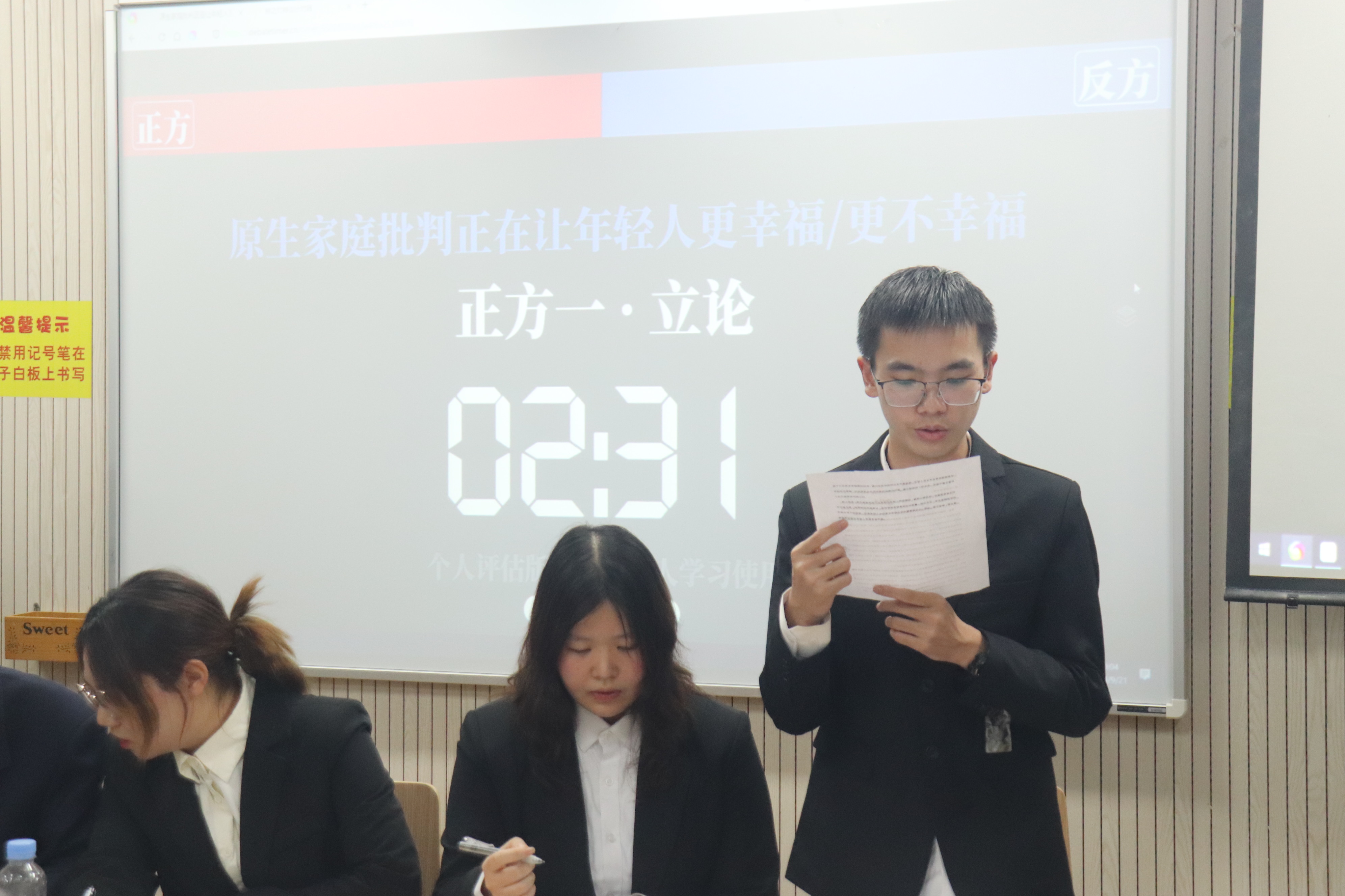 近日,海角网 动科辩论队举办了一场精彩绝伦的招新表演赛,此次比赛围绕 “原生家庭批判正在让年轻人变得更 / 更不幸福” 这一辩题展开,吸引了众多同学前来观看。