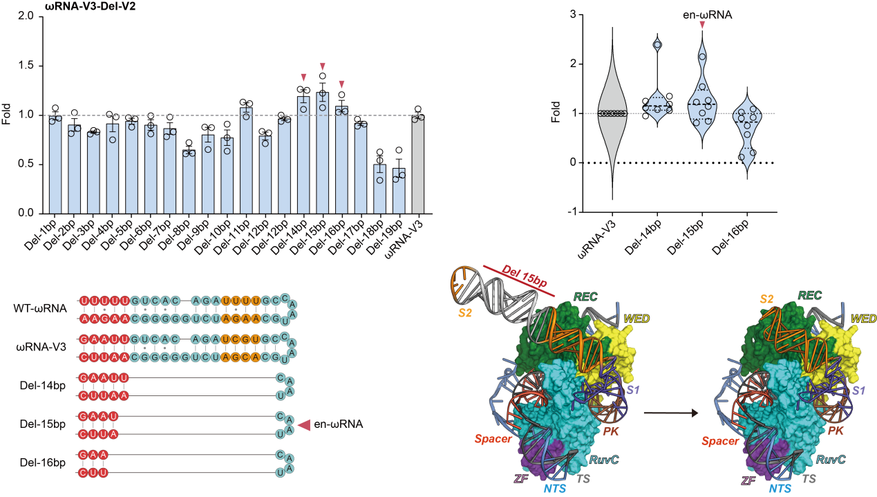 在ωRNA骨架优化方面,研究团队利用AlphaFold3对MmeFz2-ωRNA-DNA三元复合物结构进行了精准预测,针对野生型ωRNA中存在的结构冗余与不稳定序列进行定向改造和重塑,开发出截短增强型en-ωRNA。优化后的ωRNA骨架尺寸缩小30%,稳定性与转录强度显著提升,其介导的基因编辑(Indel)效率较野生型提高至16.7倍。