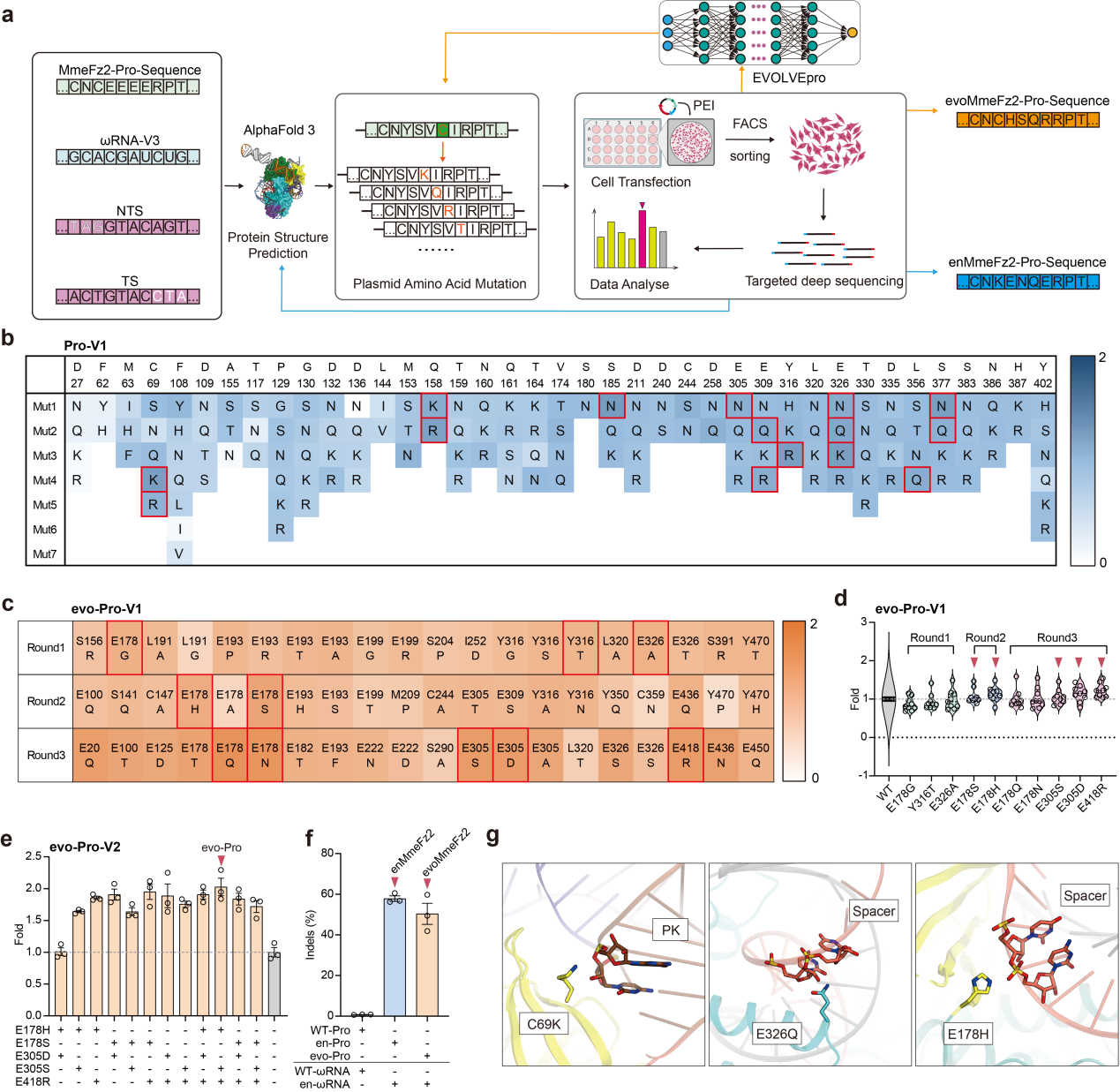 在MmeFz2蛋白优化方面,研究团队采用了AlphaFold3辅助理性设计和EVOLVEpro驱动AI进化的互补性策略。首先,基于AlphaFold3的理性设计在蛋白-核酸界面设计了141个单点突变,通过细胞内源位点打靶验证实验筛选出C69K等高效突变体,进一步通过两轮组合优化获得理性设计最优突变体en-Pro(C69K/E305N/E326Q)。该突变体与en-ωRNA组合形成enMmeFz2-ωRNA系统,其基因编辑效率较原始版本提升至76.0倍。同时,研究将141个单点突变体的实验结果导入近期报道的EVOLVEpro蛋白语言模型,通过三轮“预测—验证”迭代筛选,选取效率最高的5个预测突变进行组合,得到AI进化突变体evo-Pro(E178H/E305S/E418R)。其与en-ωRNA组合形成了evoMmeFz2-ωRNA系统,编辑效率较原始版本提高至66.1倍。此外,研究通过在evoMmeFz2-ωRNA系统基础上融合非特异性DNA结合结构域(HMG-D),使该系统平均编辑效率进一步提升1.2倍。
