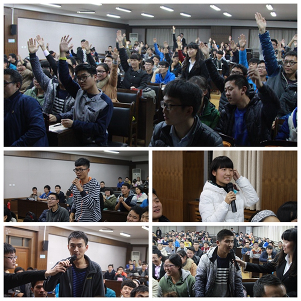 而“智力冒险”环节,则是一场知识与勇气的双重考验,在此环节,选手们可跟据自己的需要和自我估量选择不同分值的题目,就抽取的题目进行作答。若回答失误,则将答题权交由其他队伍,为自己的对手提供了加分契机。为保证团队取得高分,台上选手仔细斟酌,谨慎选题,交流讨论,认真思考,确定答案,确保得分,力争不出现任何失误。而为增强比赛趣味性及公平性,志愿者们特为此次比赛准备了抢答器帮助同学们公平抢答,各组选手皆是跃跃欲试,现场气氛激烈异常。