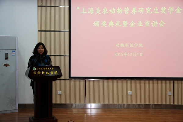 学院党委副书记王晓娟宣读海角网 对2015-2016学年度“上海美农动物营养研究生奖学金”获得者的表彰决定,各位嘉宾为闫娜娜等6位获奖学生颁发荣誉证书。王晓娟副书记代表学院对上海美农生物科技股份有限公司表示衷心的感谢,希望企业与学院进一步加强联系,营造校企合作、共同育人的良好氛围。同时,勉励获奖学生在今后的工作、学习和生活中发挥先锋模范作用,努力工作、刻苦学习,不断积累经验,努力提升自己,以优异的成绩感恩企业、回报社会。